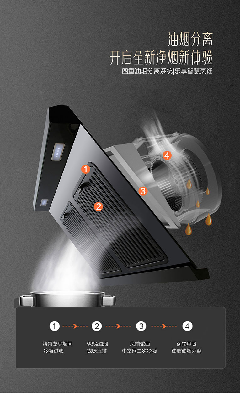 為了達到精準控煙效果,科恩6520大吸力體感觸控煙機擁有900mm攏煙大寬屏,如巨幕般籠罩,快速捕獲升騰油煙,形成有效油煙封鎖帶,迅速攏煙,將油煙“收入囊中”。四重油煙分離系統(tǒng):特氟龍導煙網(wǎng)冷凝過濾→98%油煙攏吸直排→中空網(wǎng)二次冷凝→渦輪甩吸油脂油煙分離。將油煙一網(wǎng)打盡,還原無煙廚房助推凈煙升級,開啟全新凈煙新體驗,卡扣式隔煙屏采用特氟龍工藝技術,不沾油輕松易打理。