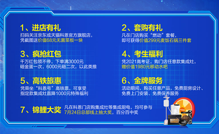 更有7大特權(quán)豪禮:進(jìn)店禮、套購(gòu)禮、瘋搶紅包、考神福利、高鐵旅惠、金牌服務(wù)等助力本次活動(dòng)。除此之外,7月24日集成灶十大品牌、廚電行業(yè)十大品牌科恩集成灶總部將進(jìn)行“燃動(dòng)七月”線上直播抽錦鯉大獎(jiǎng)活動(dòng),高端智能指紋鎖、多功能蒸汽掛燙機(jī)、高端嵌入式烤箱&蒸箱、RO速熱凈飲移動(dòng)水吧以及炒鍋、蒸鍋、精品刀具等多種豪禮放送,百分百中獎(jiǎng),更多特權(quán)優(yōu)惠請(qǐng)前往科恩全國(guó)專賣店咨詢。