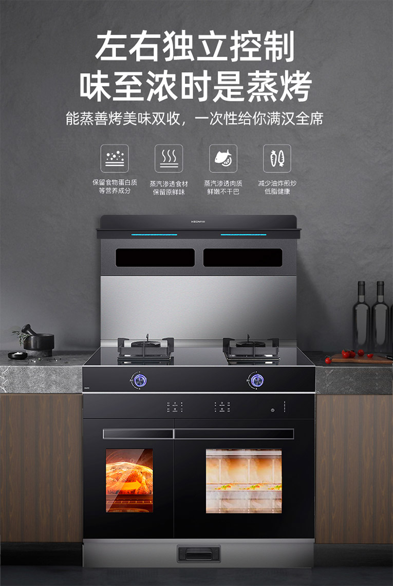 科恩S450左右蒸烤集成灶不僅將集成灶下置空間進行了重新設計,80L大容量整體拉伸內(nèi)膽設計,30L烤箱容量加50L蒸箱容量,左烤右蒸,同時獨立操作,箱體不串味,烹飪更高效的同時還帶來了更好的烹飪體驗。120℃高溫速蒸,急速加熱,快速出蒸汽,蒸汽底盤迅速產(chǎn)生和分配熱氣,包裹食材,快速鎖鮮,留住營養(yǎng)與纖維;烤箱上下雙加熱系統(tǒng)立體交互,火力均勻外焦里嫩,360°立體燒烤功能,內(nèi)部熱量均勻分布,讓每層食物都保持高品質(zhì)烘焙效果,烤出驚艷好味道。