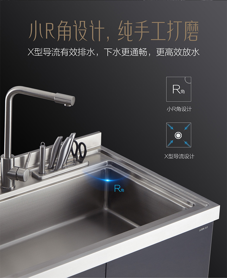 科恩集成凈洗中心,包含了X1(子母槽儲物柜款)、X2(雙槽儲物柜款)、X3(子母槽消毒柜款)、X5(雙槽超聲波消毒柜款)、X6(子母槽洗碗機十件套)產(chǎn)品。以集成水槽X1為例,堅持品質(zhì)選材,手工匠心鑄造,利用先進科技打造高端品質(zhì),外觀設(shè)計精巧,折彎手工鑄造,一焊一接美觀大方,完美詮釋高端廚房格調(diào)生活。X1集成水槽集食材、水洗清潔、熱水系統(tǒng)、凈水系統(tǒng)、垃圾處理、收藏儲物為一體,多功能臺面設(shè)計,一切都變得如此的順手,水龍頭采用360°萬向設(shè)計,出水均勻,掌控自如。另外,X1在性能、品質(zhì)上都極為出眾,首先,900mm寬體設(shè)計,大水槽加寬加深,可移動式子水槽,單槽秒變雙槽,有效提高了水槽利用率,增加了廚房收納空間,X型導(dǎo)流流水,搭配小R角設(shè)計,應(yīng)用拉絲工藝,水槽干燥不積水,四條引水線,引導(dǎo)水流輕松下水。
