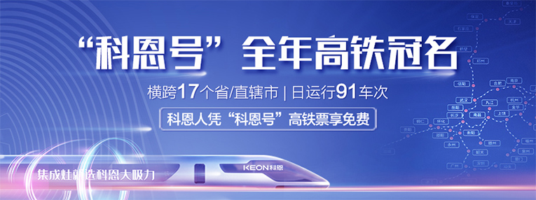 作為集成灶十大品牌、廚電行業(yè)十大品牌的科恩集成灶,杭紹臺(tái)高鐵的建成開通,開啟了科恩集成灶發(fā)展新篇章。2021年,斥資800萬,“科恩號(hào)”高鐵品牌專列馳騁大江南北,橫跨17個(gè)省/直轄市,日運(yùn)行91車次。