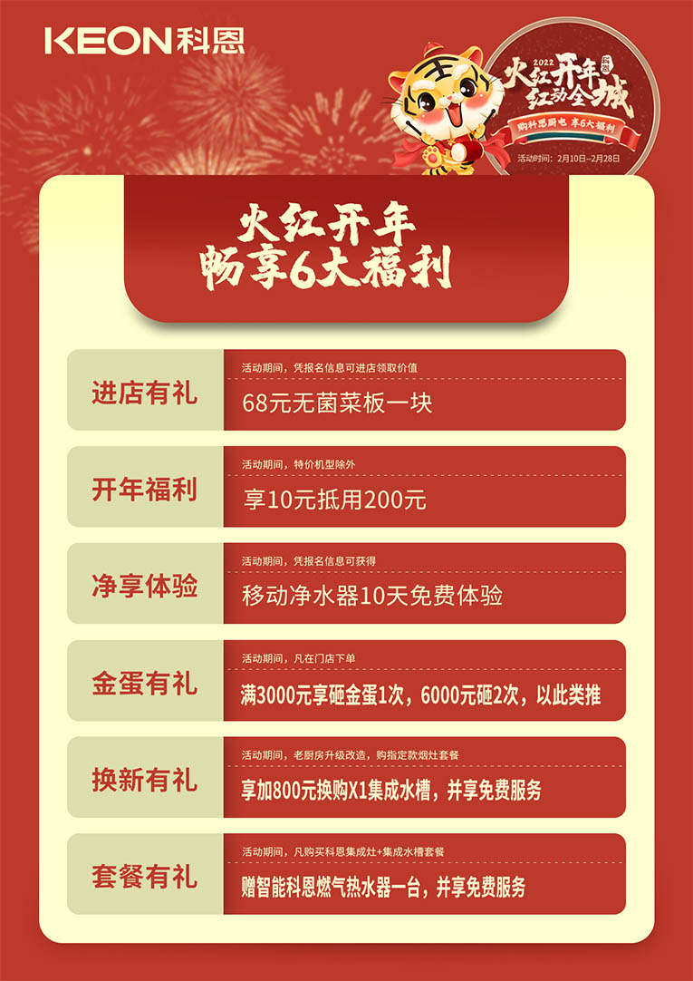 火紅開年,暢享6大福利,2月10日——2月28日前往集成灶十大品牌、廚電行業(yè)十大品牌科恩集成灶全國各大專賣店,就能享受以下特權:進店有禮,活動期間憑報名信息可進店領取價值68元無菌菜板一塊;開年福利進門店享10元抵用200元福利,特價機型除外;凈享體驗,活動期間憑報名信息可獲得科恩移動凈水器10天免費體驗;金蛋有禮,活動期間凡在門店下單,滿3000元享砸金蛋1次,6000元砸2次,以此類推;換新有禮,活動期間老廚房升級改造,購指定款煙灶套餐,享加800元換購X1集成水槽,并享免費服務;套餐有禮,活動期間凡購買科恩集成灶+集成水槽套餐,贈智能科恩燃氣熱水器一臺,并享免費服務。