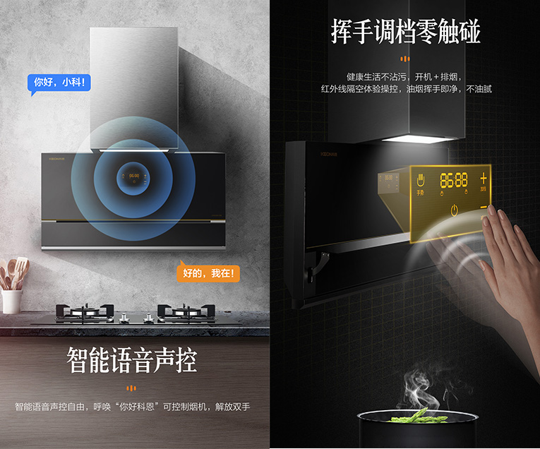 目前大多數(shù)油煙機(jī)都需要進(jìn)行手動(dòng)按鍵控制,有時(shí)候會(huì)出現(xiàn)炒菜到一半發(fā)現(xiàn)油煙機(jī)沒(méi)開(kāi),手上油污太多按鍵不靈敏等情況,科恩新一代大吸力煙機(jī)7350最大的亮點(diǎn)在于擁有智能語(yǔ)音控制與體感操控,健康生活不玷污,開(kāi)機(jī)+排煙控制,隔空體驗(yàn)操控,解放雙手不油膩。