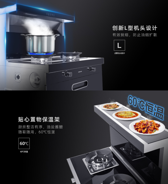 創(chuàng)新L型機(jī)頭設(shè)計(jì),寬域攏煙,防止油煙擴(kuò)散,LED節(jié)能照明燈,聚焦視線,沉浸舒適氛圍,60℃恒溫置物臺(tái) ,從此冷菜是路人,廚房整潔有序,油鹽醬醋隨拿隨放。