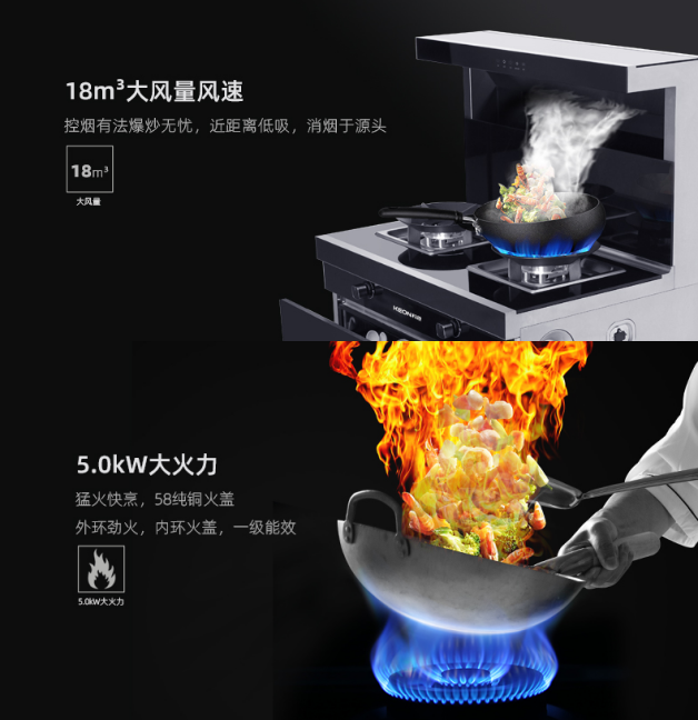 5.0kW大火力,58純銅火蓋,猛火快烹,外環(huán)勁火,一級(jí)能效,18m3颶風(fēng)吸力,低空近吸,控?zé)熡械?,爆炒無(wú)憂。