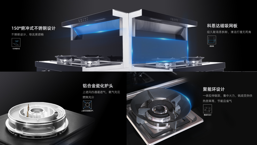 150°俯沖式不銹鋼設(shè)計(jì),導(dǎo)流更輕松,排煙更順暢,科恩達(dá)磁吸網(wǎng)板,耐用易拆卸,清潔打理360°無(wú)死角,鋁合金磁化爐頭+一體拉伸聚能環(huán)設(shè)計(jì),受熱更均勻,氧氣更充足,燃燒更充分。
