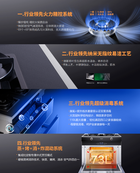 C系列集成灶配備的四項(xiàng)行業(yè)領(lǐng)先創(chuàng)新技術(shù):火力精控系統(tǒng)、納米無(wú)指紋易潔工藝、超級(jí)消毒系統(tǒng)、蒸烤消炸混動(dòng)系統(tǒng)——直擊當(dāng)下消費(fèi)痛點(diǎn),徹底解決用戶使用需求,從大火力大吸力、易清潔易打理、廣收納懂消殺、多功能全集成四個(gè)維度力破當(dāng)下行業(yè)四大頑固堵點(diǎn)。