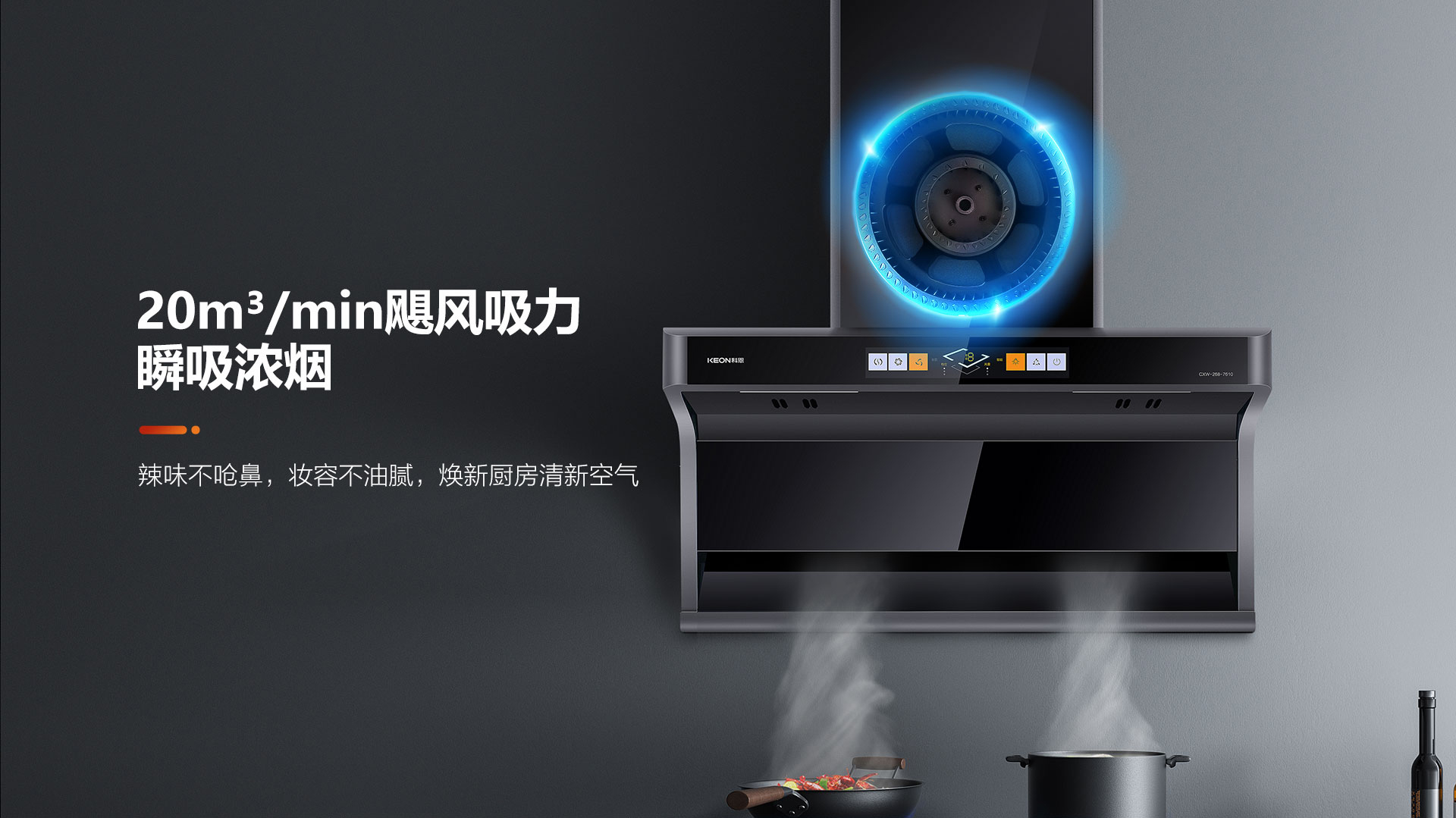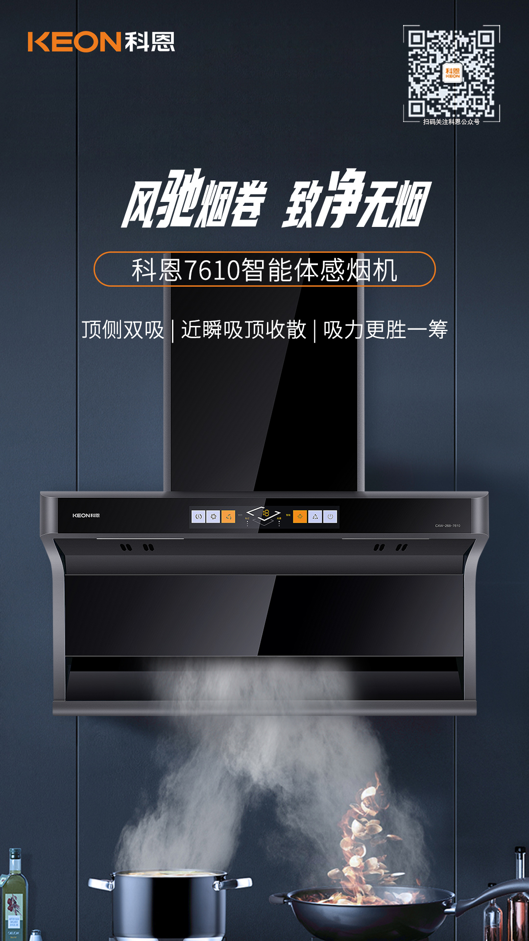 不愛下廚的理由千千萬:油煙抽不盡、味道散不出、滿室油膩膩、清潔難打理一定是阻礙我們廚藝進(jìn)階的頭號(hào)勁敵!選擇一臺(tái)好的煙機(jī),下廚煩惱一招便可迎刃而解,科恩7610頂側(cè)雙吸智能體感煙機(jī),上下雙吸組合出擊,配合颶風(fēng)大吸力,將油煙一網(wǎng)打盡,還你清新廚房!