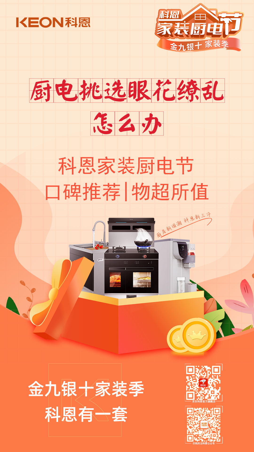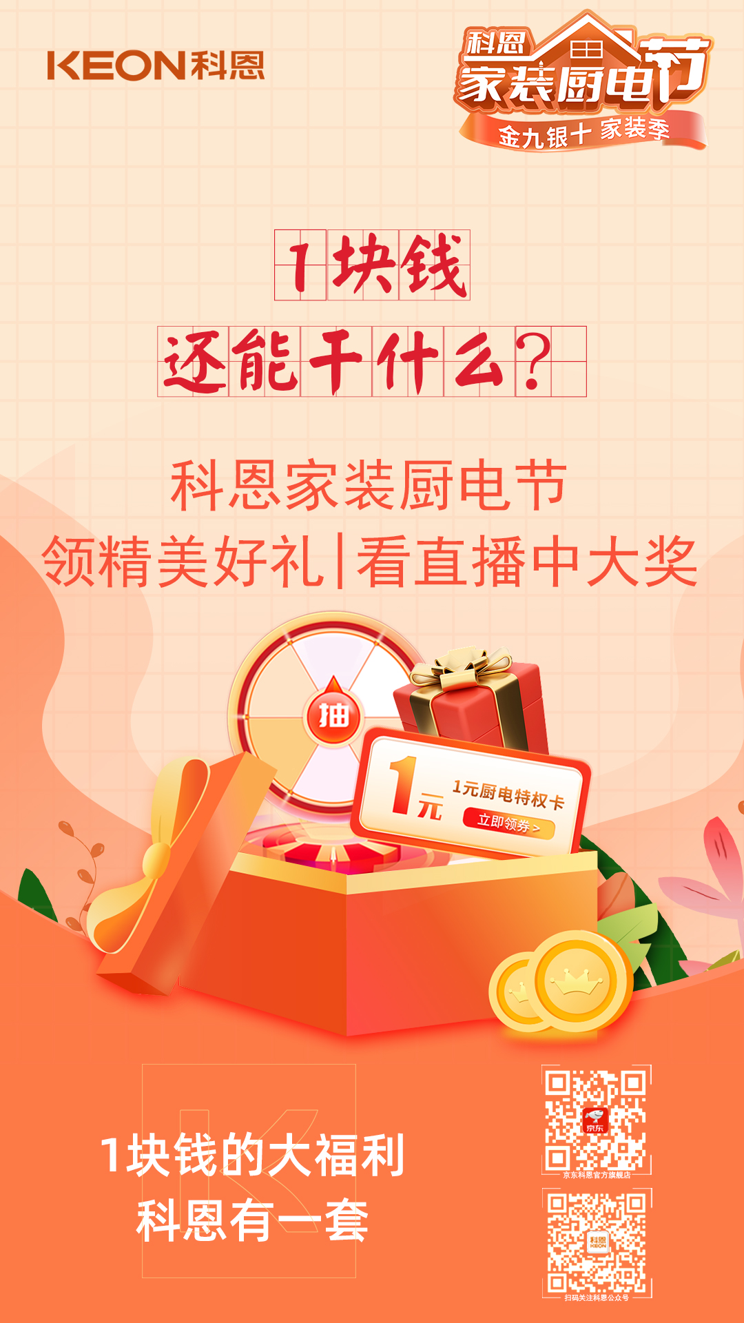 金九銀十家裝季,科恩家裝廚電節(jié),1元特權(quán)卡,樂(lè)享六喜禮,福利連連,驚喜不斷,趁此機(jī)會(huì),用更優(yōu)惠的價(jià)格購(gòu)得稱心如意的廚電好物,年前入住美滋滋!