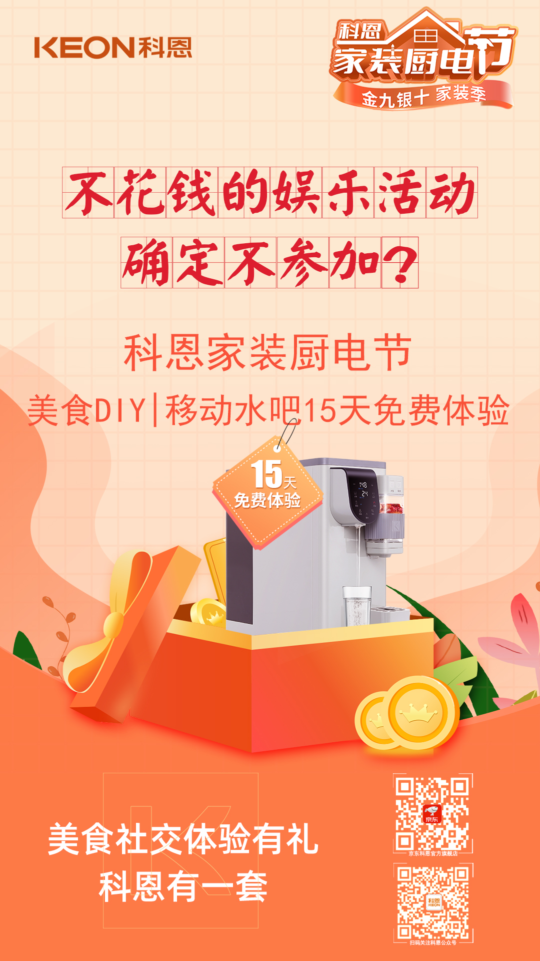 明天就是周末了,別只在家擺爛!可逛街費(fèi)錢,宅家費(fèi)電,有沒(méi)有什么不花錢又能carry全場(chǎng)的娛樂(lè)活動(dòng)?來(lái)科恩家裝廚電節(jié),場(chǎng)地、設(shè)備、機(jī)器早已準(zhǔn)備就緒,美食DIY,沉浸式體驗(yàn),共同制作美食,一起分享心得,還有15天免費(fèi)體驗(yàn)的移動(dòng)水吧帶回家,美食社交,體驗(yàn)有禮,確定不參加?