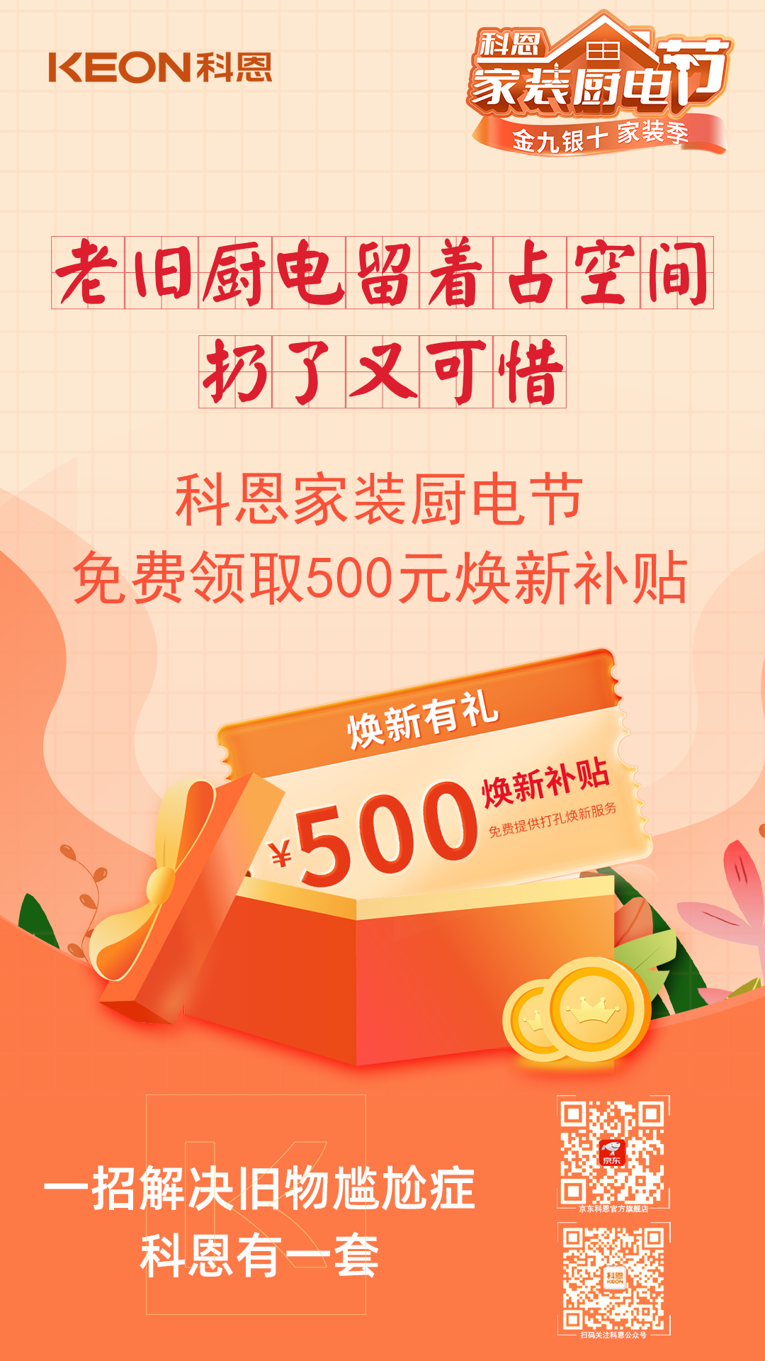 用了好多年的老舊廚電,不僅耗能大,放在家里更顯臟亂差,爸媽不舍得換,留著占空間,扔了又可惜,就這樣將就湊合過(guò)了一年又一年,恰逢其時(shí),參與科恩家裝廚電節(jié),免費(fèi)領(lǐng)取領(lǐng)取超值煥新煥新補(bǔ)貼,告別老舊廚電,開(kāi)啟美好生活,一招解決舊物尷尬癥,科恩有一套!