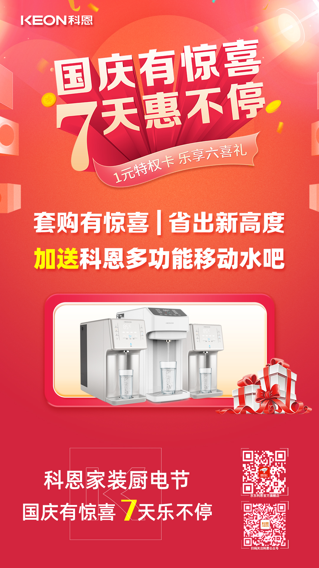 1元瘋搶?zhuān)o力國(guó)慶,科恩家裝廚電節(jié)國(guó)慶專(zhuān)輯——國(guó)慶有驚喜,7天惠不停正火熱進(jìn)行中,力度空前,更有豪華大禮包驚喜贈(zèng)送,全民鉅惠,就在科恩家裝廚電節(jié),更多鉅惠活動(dòng)請(qǐng)?jiān)斣?xún)科恩各大門(mén)店!