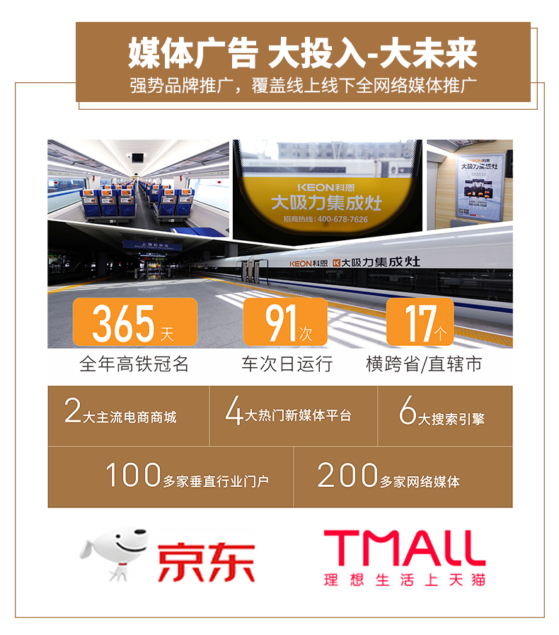 科恩集成灶自2021年以來(lái)全力加速品牌推廣進(jìn)程,大手筆投放高鐵廣告,斥巨資全年冠名——“科恩號(hào)”高鐵品牌專(zhuān)列:橫跨17個(gè)省/直轄市,日運(yùn)行91車(chē)次,傳播面積之廣,受及群眾之多,在消費(fèi)者心目中有著極強(qiáng)的影響力和公信力,借助高鐵“國(guó)家名片”屬性為品牌權(quán)威背書(shū),讓“集成灶就選科恩大吸力”口號(hào)傳遍大江南北!如今,科恩電器再次重磅出擊,攜手嵊新高鐵站,強(qiáng)勢(shì)霸屏其黃金廣告C位,精準(zhǔn)覆蓋,持續(xù)品牌形象建設(shè),為品牌傳播助力加碼,實(shí)力詮釋“科恩速度”!
