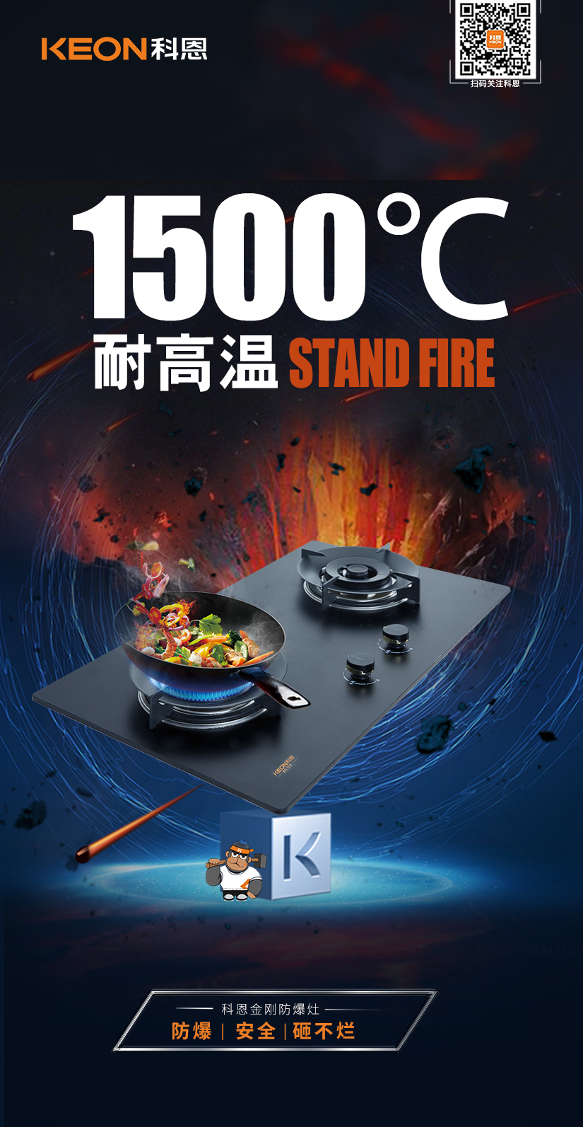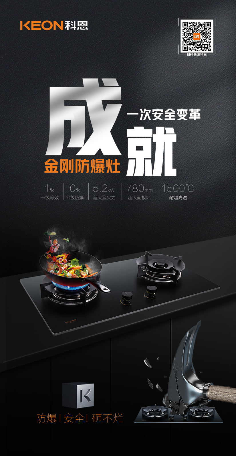 相較于市面上普通鋼化玻璃面板,科恩采用了超細(xì)晶、高均質(zhì)新型硅碳合金金剛板!更堅(jiān)可不摧 ,可耐高溫1500℃!真正做到防爆、安全、砸不爛!無(wú)懼各種極限考驗(yàn)!