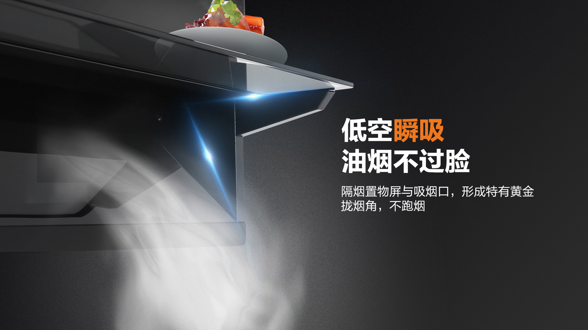 科恩平板煙機6210較之普通煙機,吸煙距離更接近油鍋,且特制的導煙置物板形成了絕佳的黃金吸煙角,搭配20m3/min颶風吸力讓油煙在鍋口就被徹底吸走,更避免了油煙過臉的煩惱,徹底告別黃臉婆煩惱。