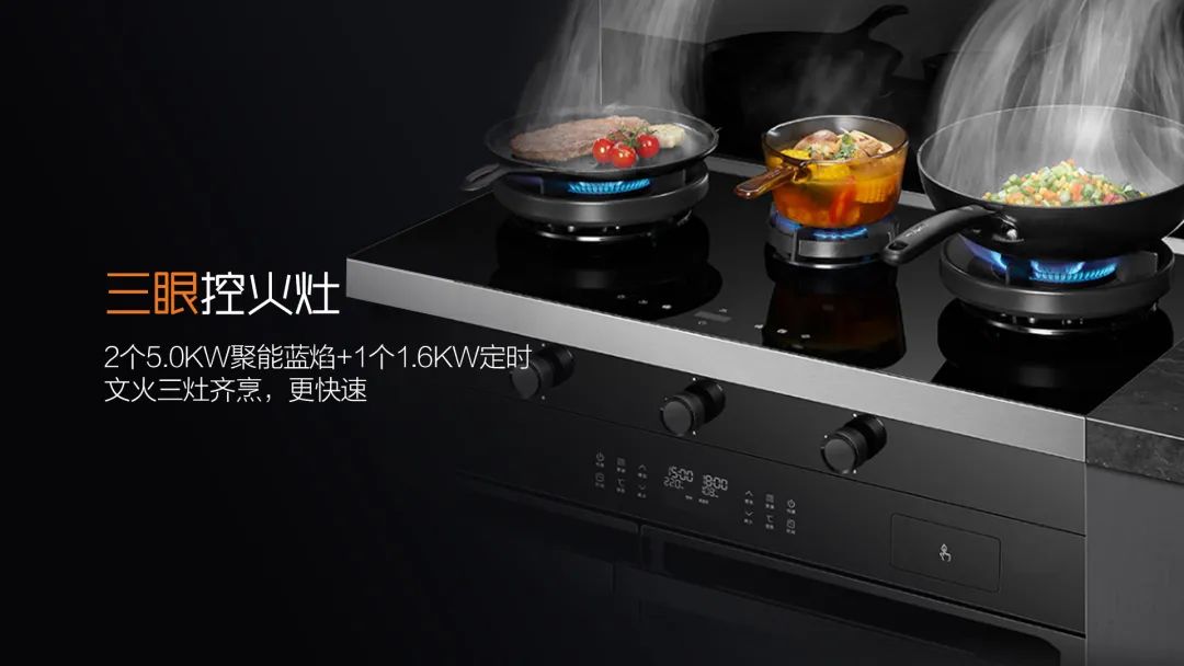 科恩A3系列獨(dú)特的三眼控火灶設(shè)置,可完美適配三代同堂家庭,2個(gè)5.0KW聚能藍(lán)焰+1個(gè)1.6KW定時(shí)文火,同時(shí)滿足爆炒和煮輔食的需求。且1.6KW小火慢煮,讓輔食擁有自己的專(zhuān)屬火力,無(wú)需費(fèi)力調(diào)整,開(kāi)啟就是最佳火力。