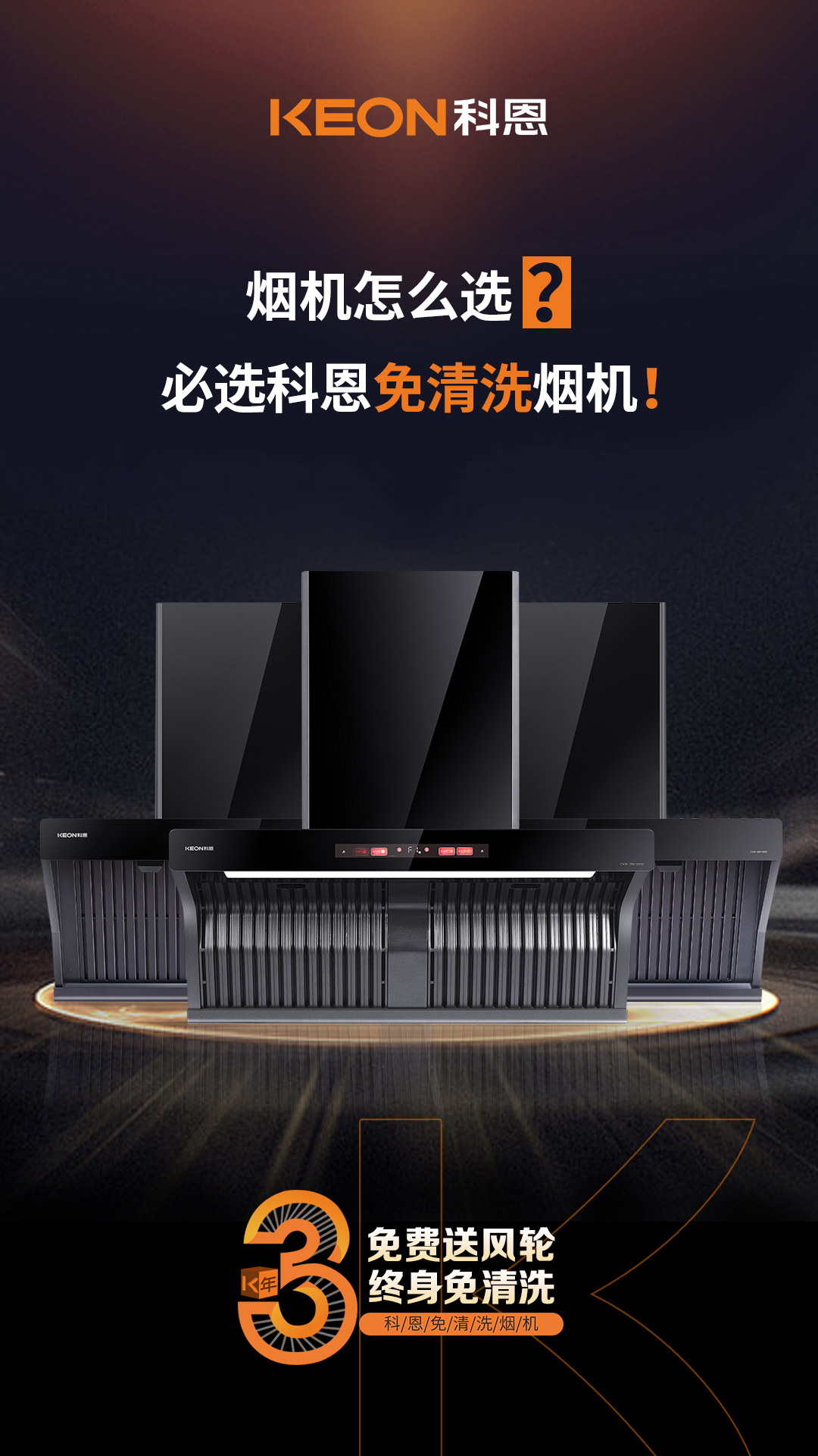 科恩電器行業(yè)率先提出3年免費送風(fēng)輪服務(wù),徹底解決殘余油脂油污問題,真正實現(xiàn)煙機(jī)終身免清洗!