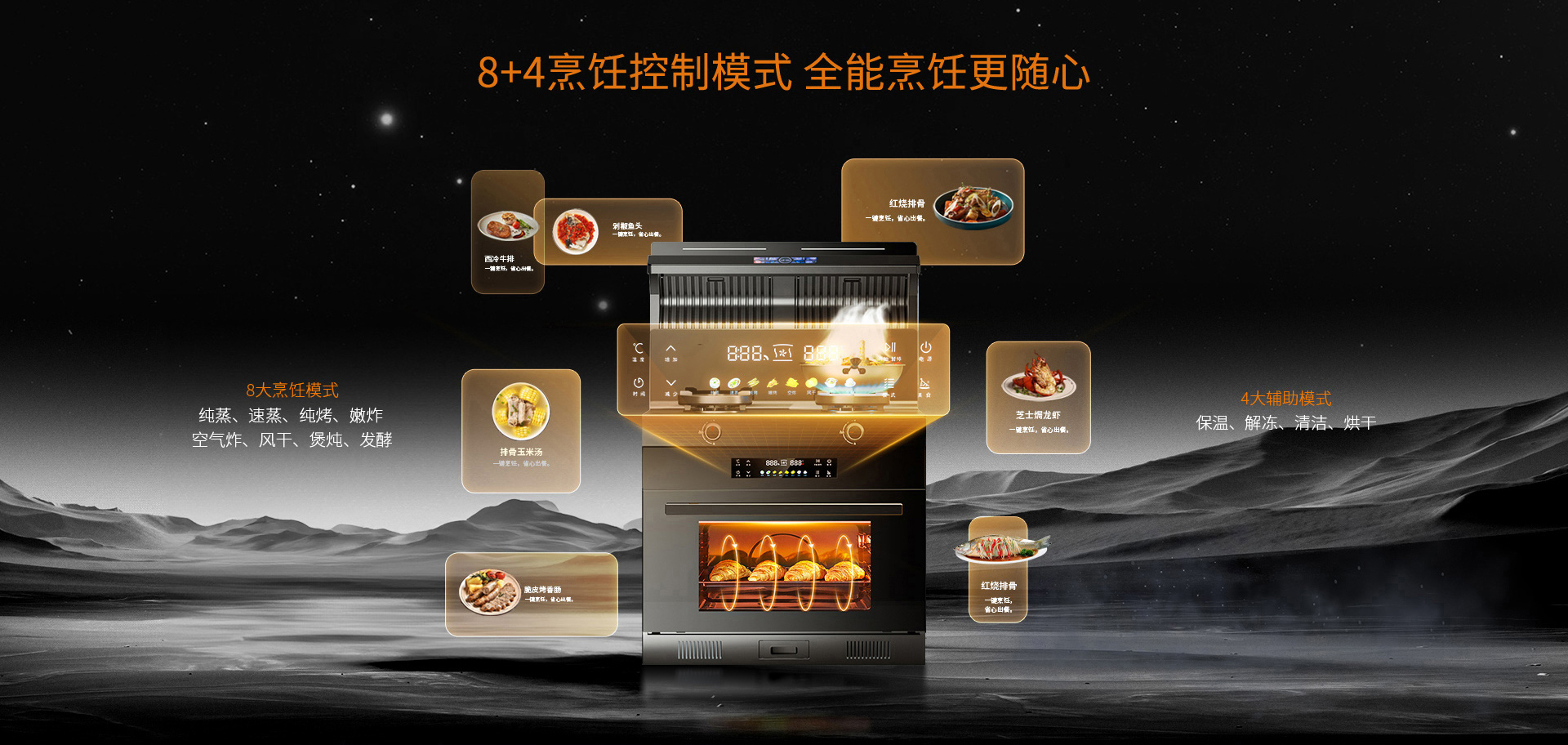 科恩G600防爆免清洗集成灶,一鍵開啟全新烹飪模式蒸烤獨(dú)立設(shè)置,30L烤箱+50L蒸箱,可一次滿足,兩種需求,且G600可實(shí)現(xiàn)蒸烤炸燉,多種烹飪方式。