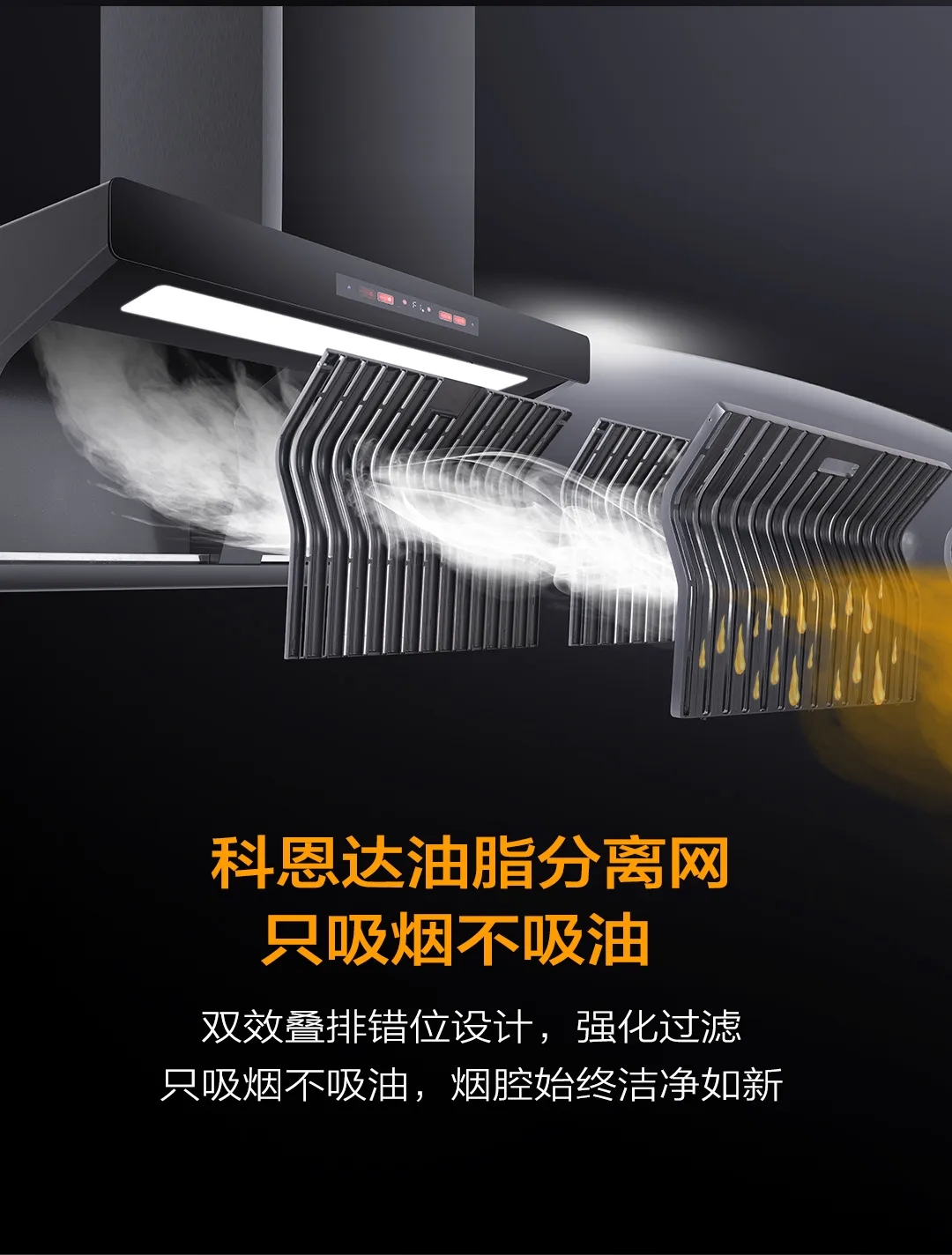 6530免清洗煙機(jī)可做到只吸煙不吸油??贫鬟_(dá)油脂分離網(wǎng)采用加厚太空壓鑄鋁,工藝嚴(yán)控,通過(guò)酸洗-噴砂-特氟龍噴涂-高溫?zé)Y(jié)而成,真正易潔、易拆、耐腐、不粘油、好打理且防火阻燃,可分離96%的油脂,讓煙腔內(nèi)部始終保持潔凈,很好的解決了煙機(jī)清洗難題。而整機(jī)特氟龍材質(zhì)真正做到了輕打理,只需輕輕一抹,油污去無(wú)蹤。