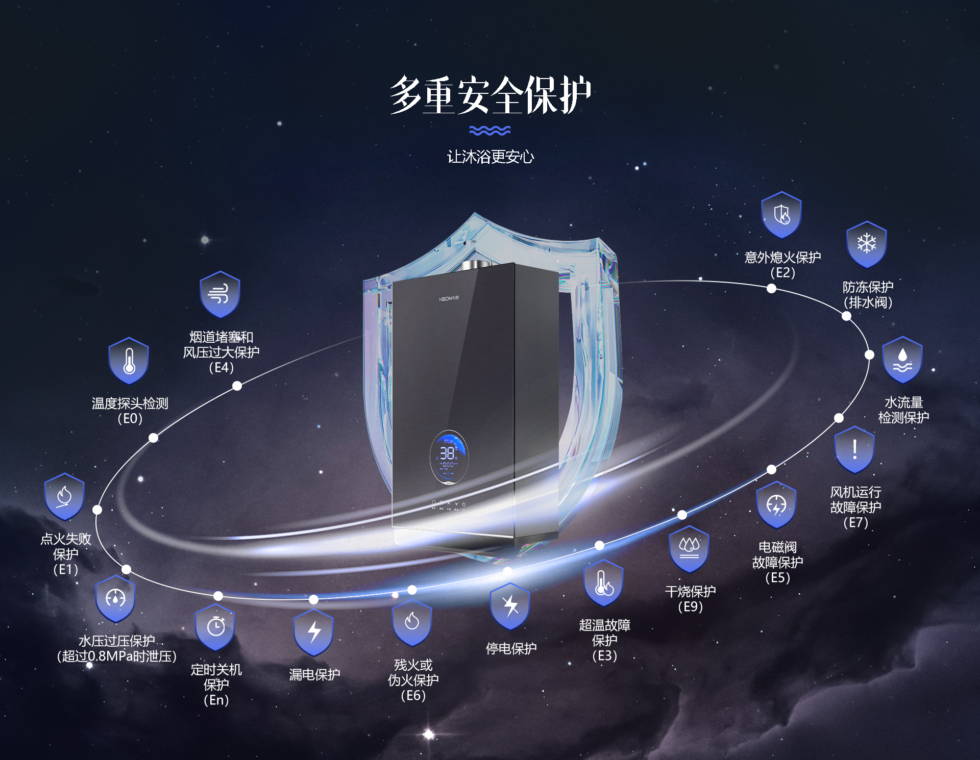 其次,關注熱水器的安全性能。科恩16KN66具有多重安全保護,包含:多項自檢和保護功能,保證熱水器正常工作。溫度探頭檢測(E0)、點火失敗保護(E1)、意外熄火保護(E2)、超溫故障保護(E3)、煙道堵塞和風壓過大保護(E4)、電磁閥故障保護(E5)、殘火或偽火保護(E6)、風機運行故障保護(E7)、干燒保護(E9)、停電保護(EE)、水壓過壓保護(超過0.8MPa時泄壓)、防凍護保護(排水閥)、水流量檢測保護、漏電保護、定時關機保護(En)等安全防護。