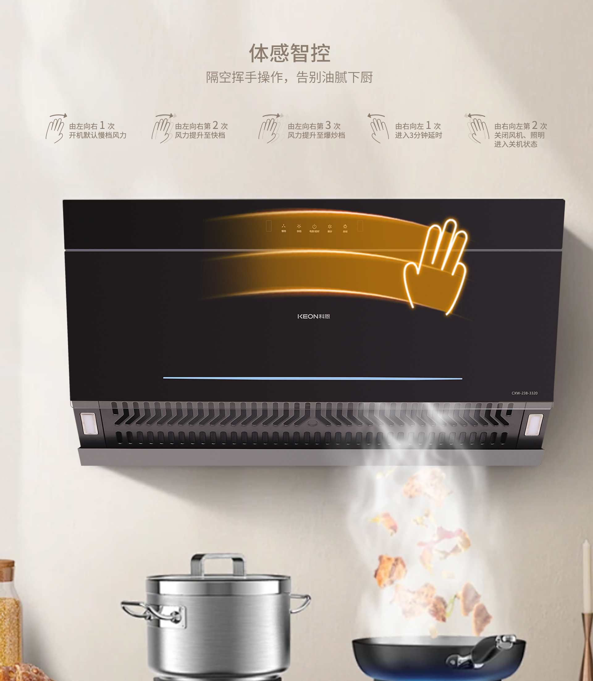 操作上的便捷性同樣不可或缺。“隔空揮手操作”讓使用者告別油膩下廚,無需觸碰煙機,通過揮手就能輕松控制開關(guān)、調(diào)節(jié)風速等功能,盡顯科技魅力。“一線天星空藍氛圍燈設(shè)計”為廚房增添時尚大氣之感,科技感十足。特氟龍工藝機身與易潔鋼化玻璃的組合,使得煙機清理變得輕而易舉,煙機清理從此不求人。