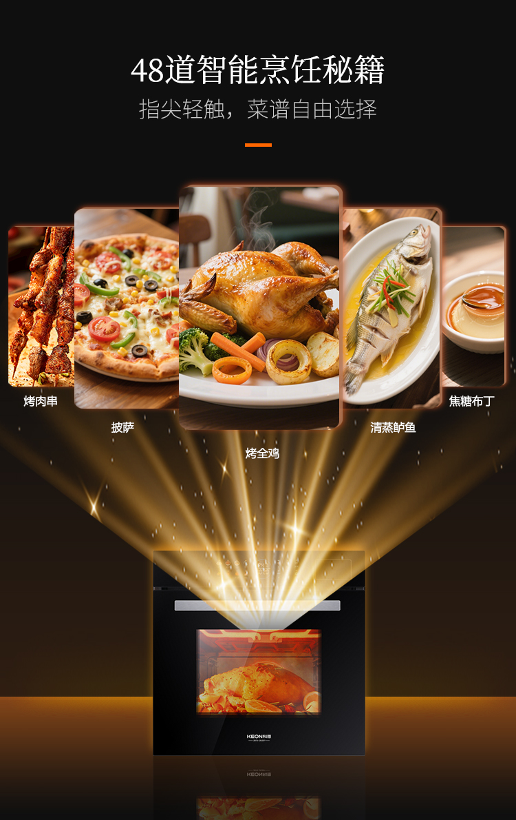 指尖輕碰超大炫彩觸控屏,界面直觀,按鍵切換自如,純蒸鎖鮮、空氣炸脆、熱風(fēng)炙烤,八大模式烹飪?nèi)堋?/span>48道星廚菜譜一鍵啟航,從健康養(yǎng)生燉到風(fēng)味炙烤,千面需求一機(jī)全擎破譯。