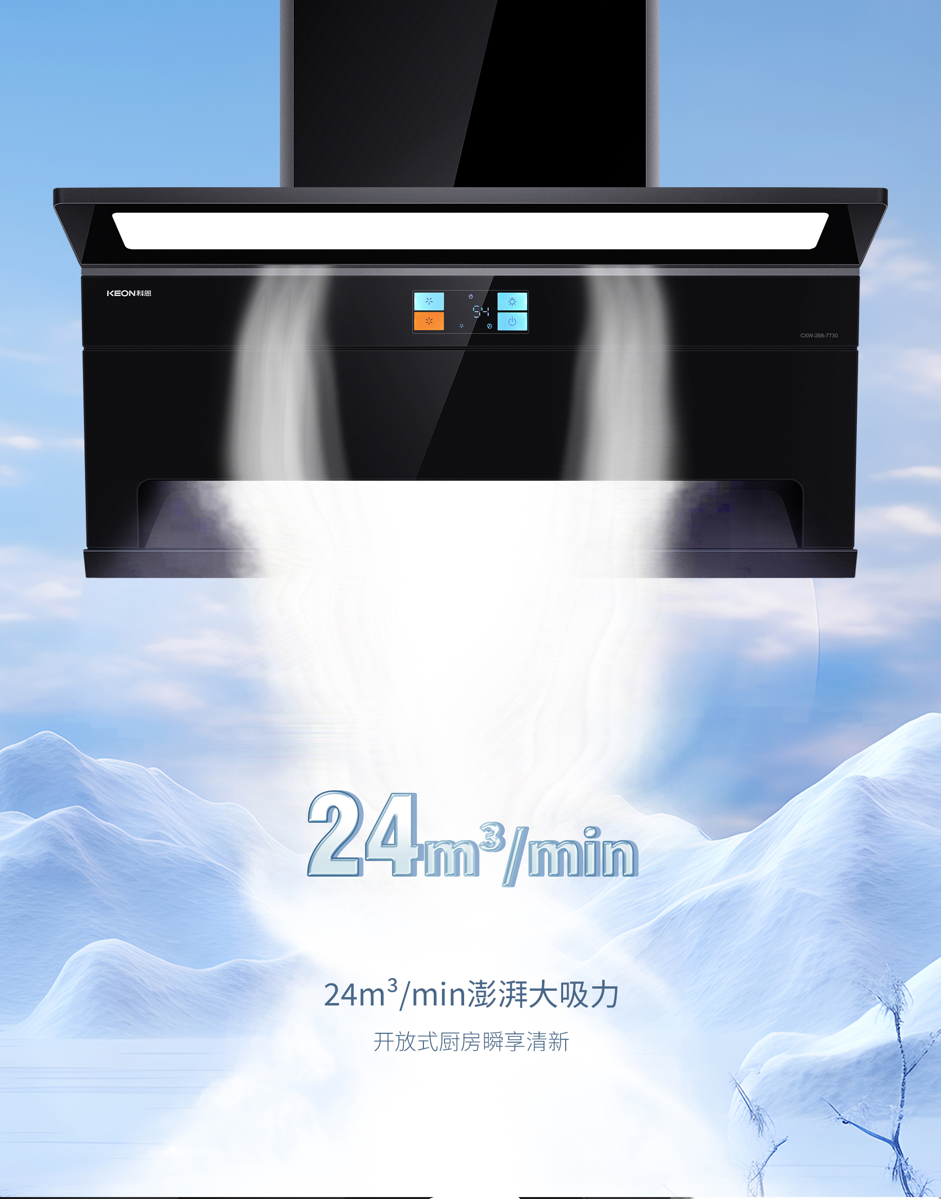 24m³/min颶風(fēng)吸力+1000Pa風(fēng)壓,低位側(cè)吸,鎖定升騰油煙;高位頂吸,攔截逃逸余煙;開放式廚房也能瞬享清新。120°天鵝頸設(shè)計(jì)掀起空間革命,2cm超薄機(jī)身釋放臺面空間,從此顛勺不碰頭,烹飪自如,科恩7730煙機(jī)重新定義凈煙美學(xué)。