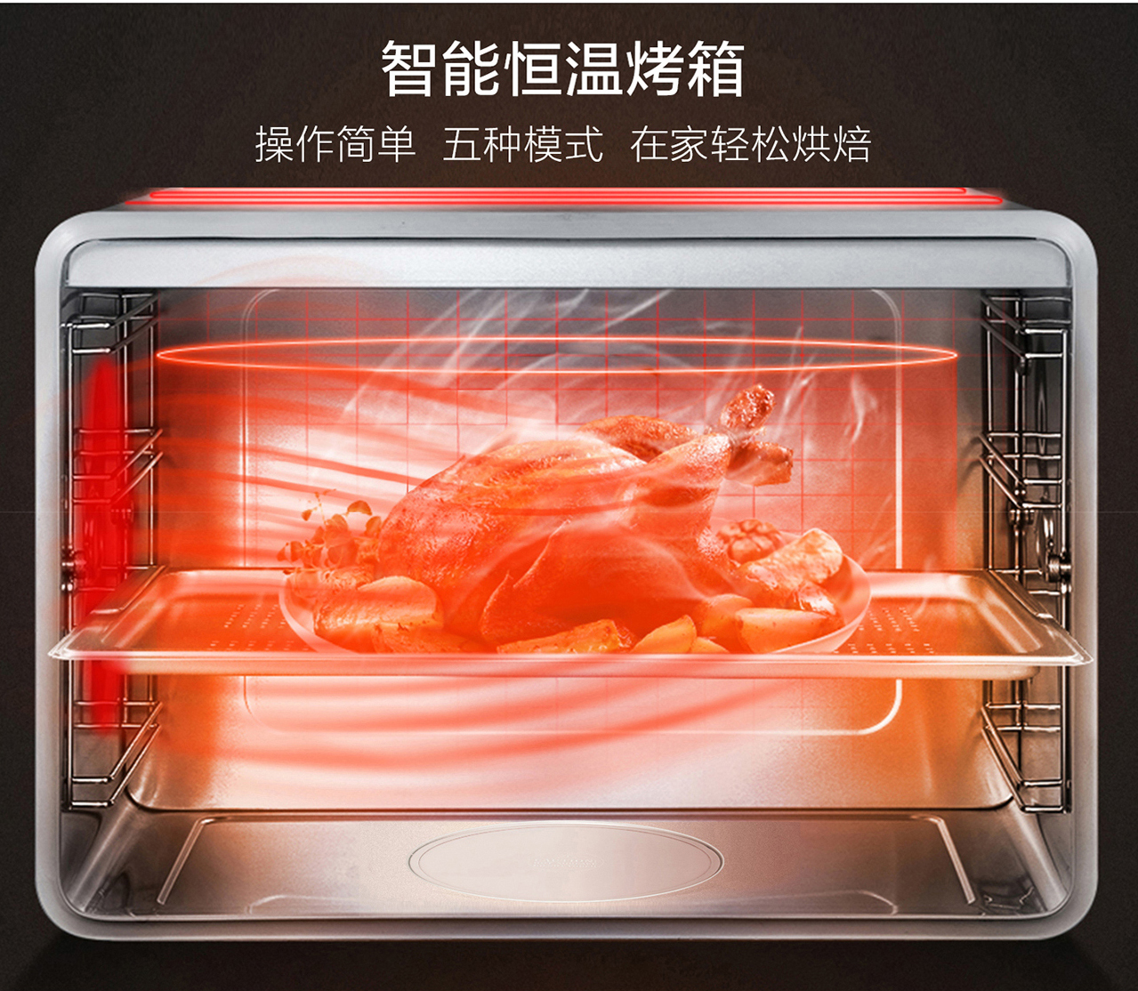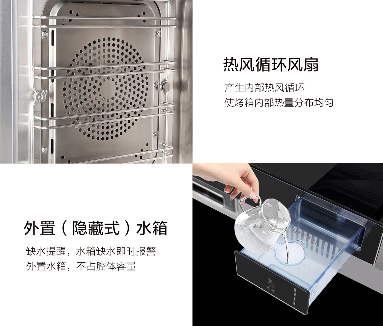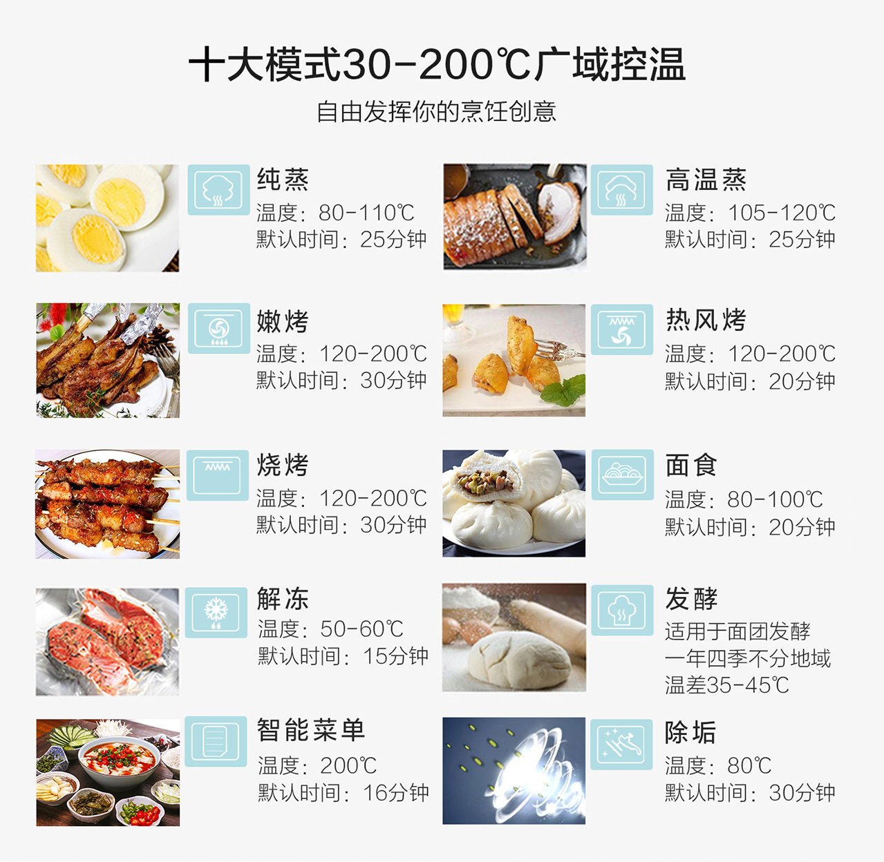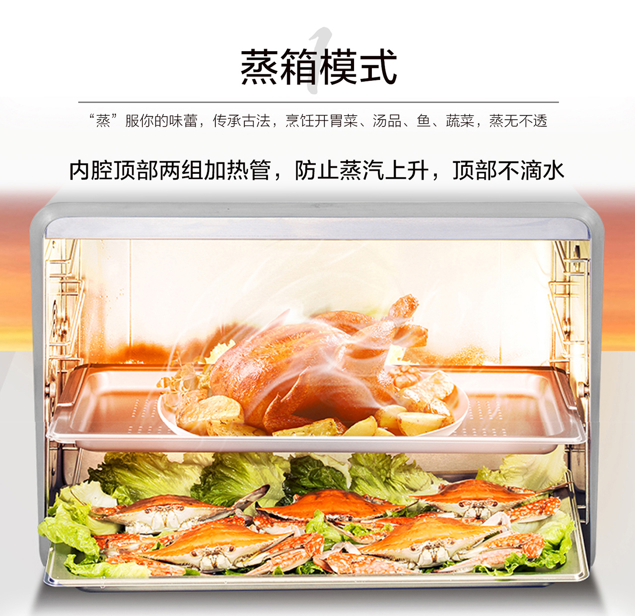62L大容量食品級304不銹鋼內(nèi)膽,上下4層設(shè)計,9種蒸烤模式。