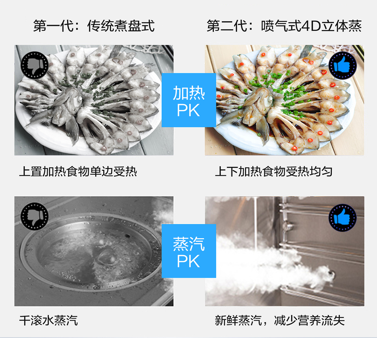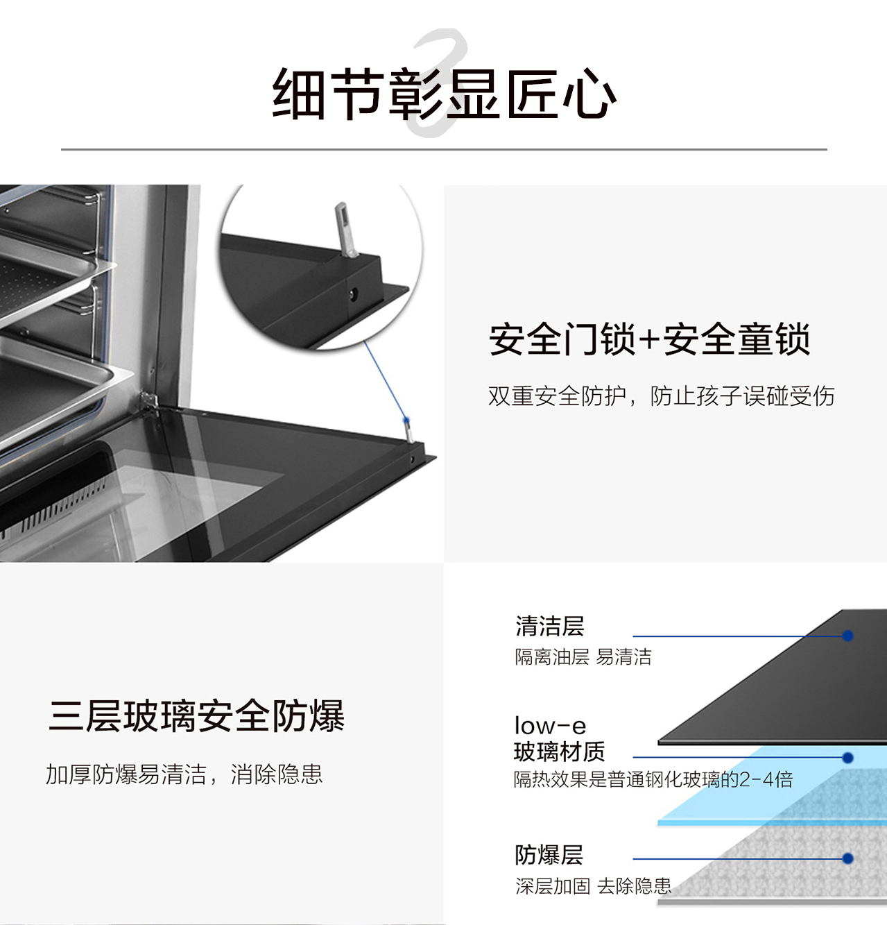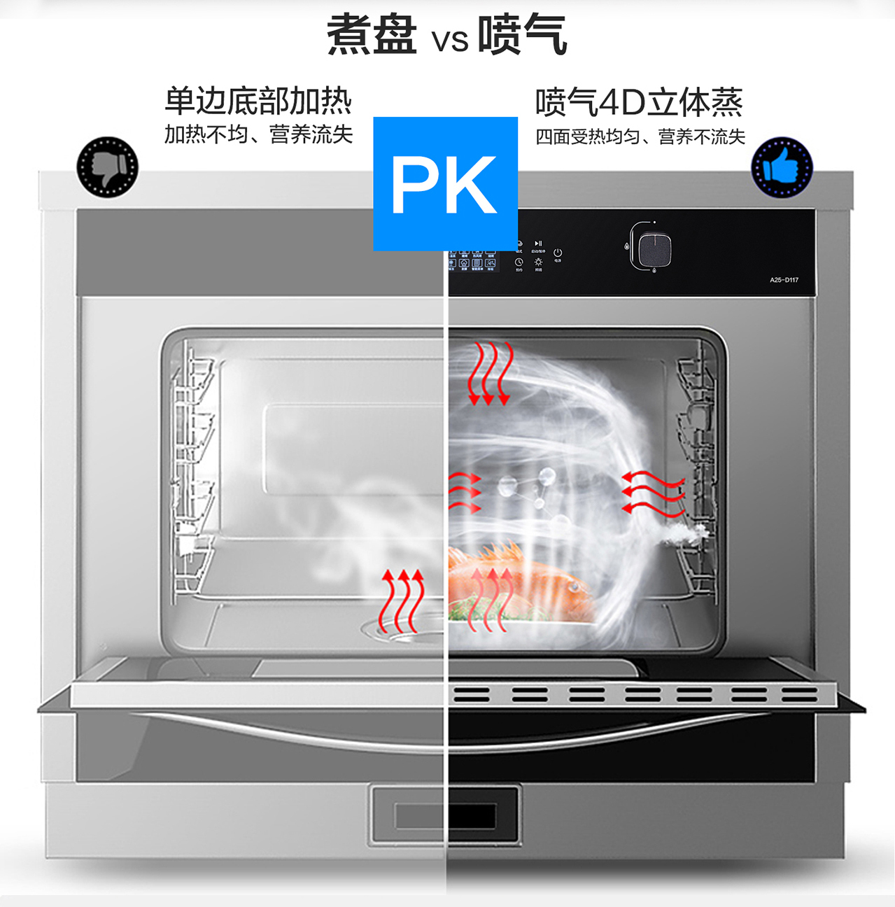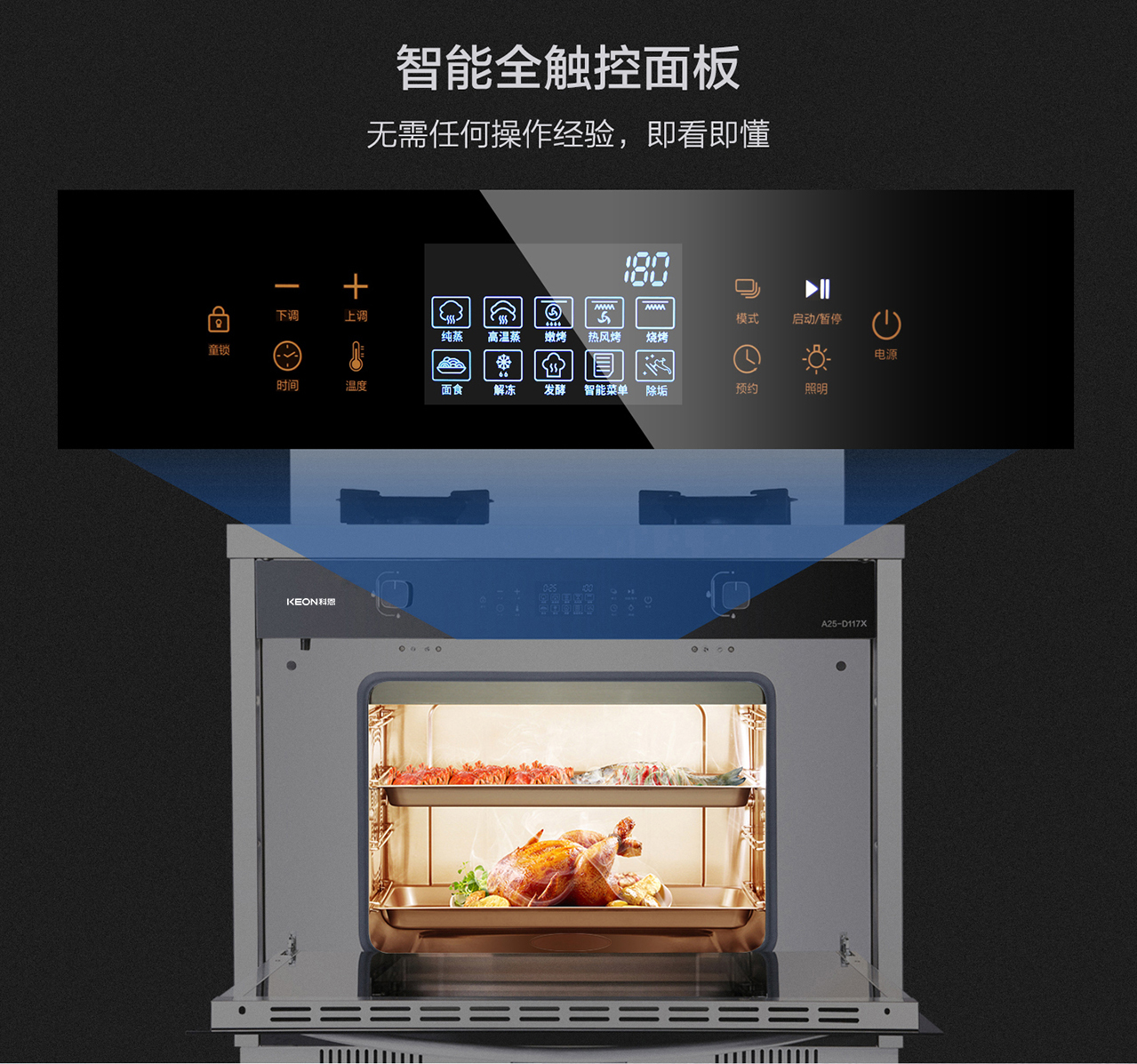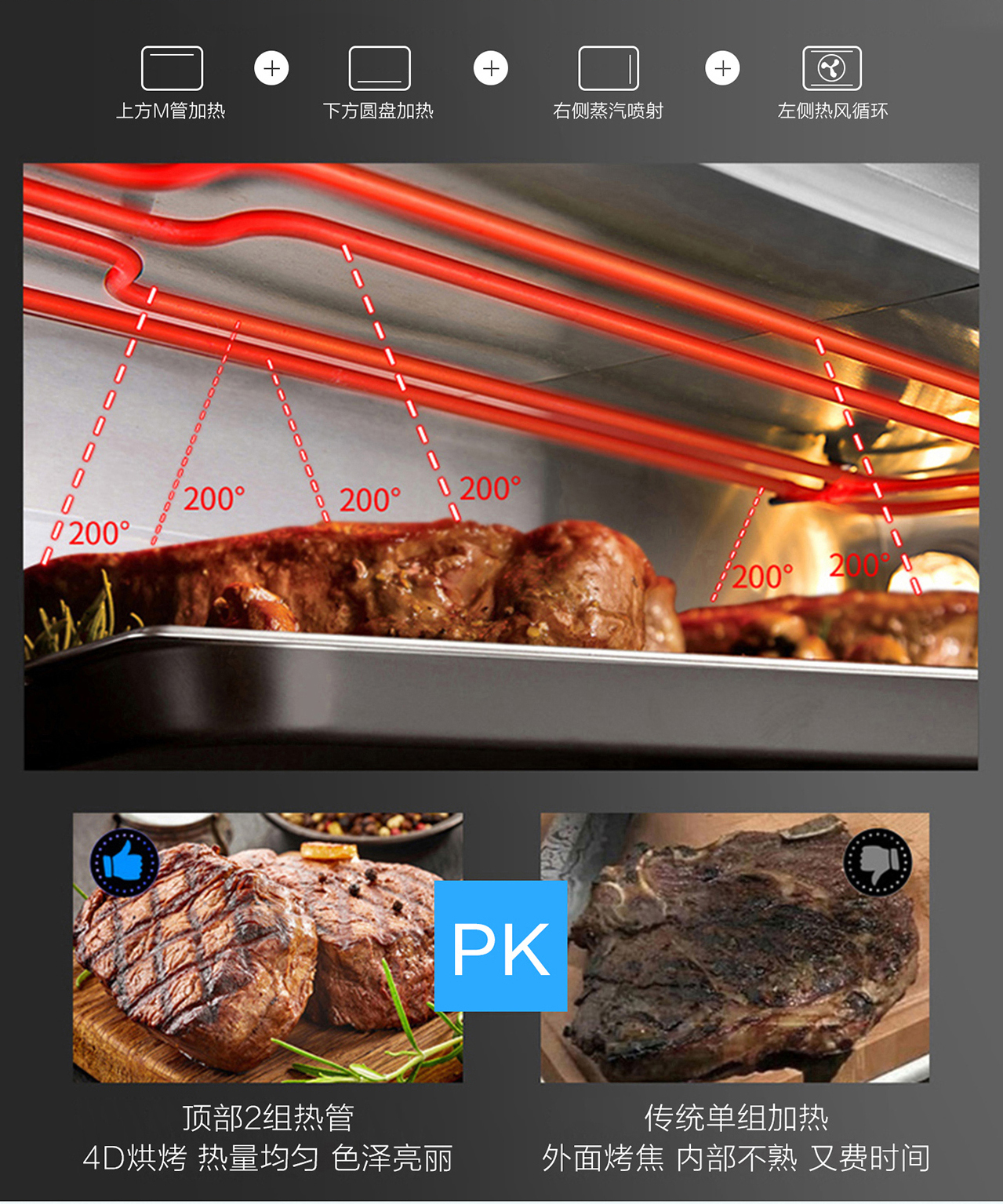 62L大容量食品級304不銹鋼內(nèi)膽,上下4層設(shè)計,9種蒸烤模式。