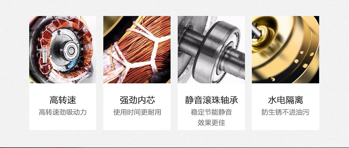 - 全封閉雙滾珠靜音電機,高速運轉(zhuǎn)不顛簸,高效耐用,防銹耐污。