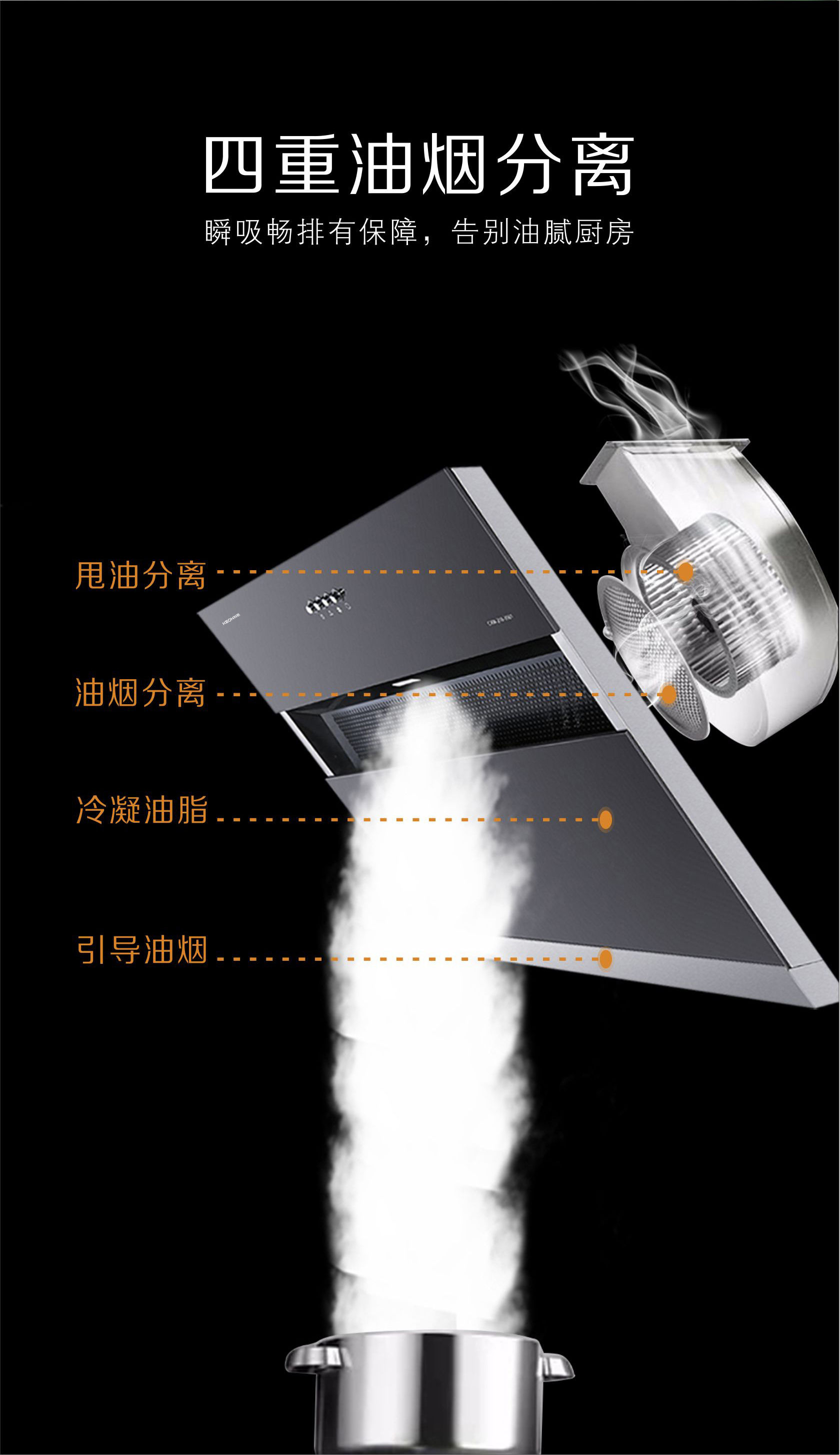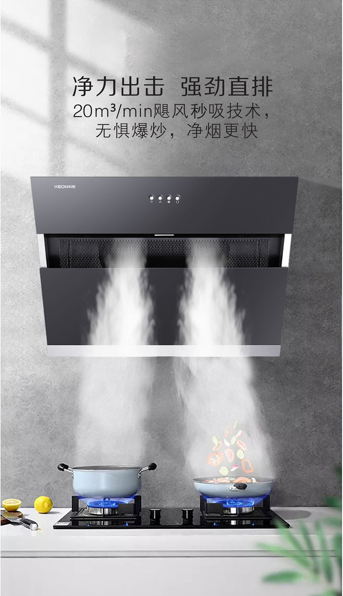 - 凈力出擊,強(qiáng)勁直排,颶風(fēng)爆吸技術(shù),無懼爆炒,凈煙更快。