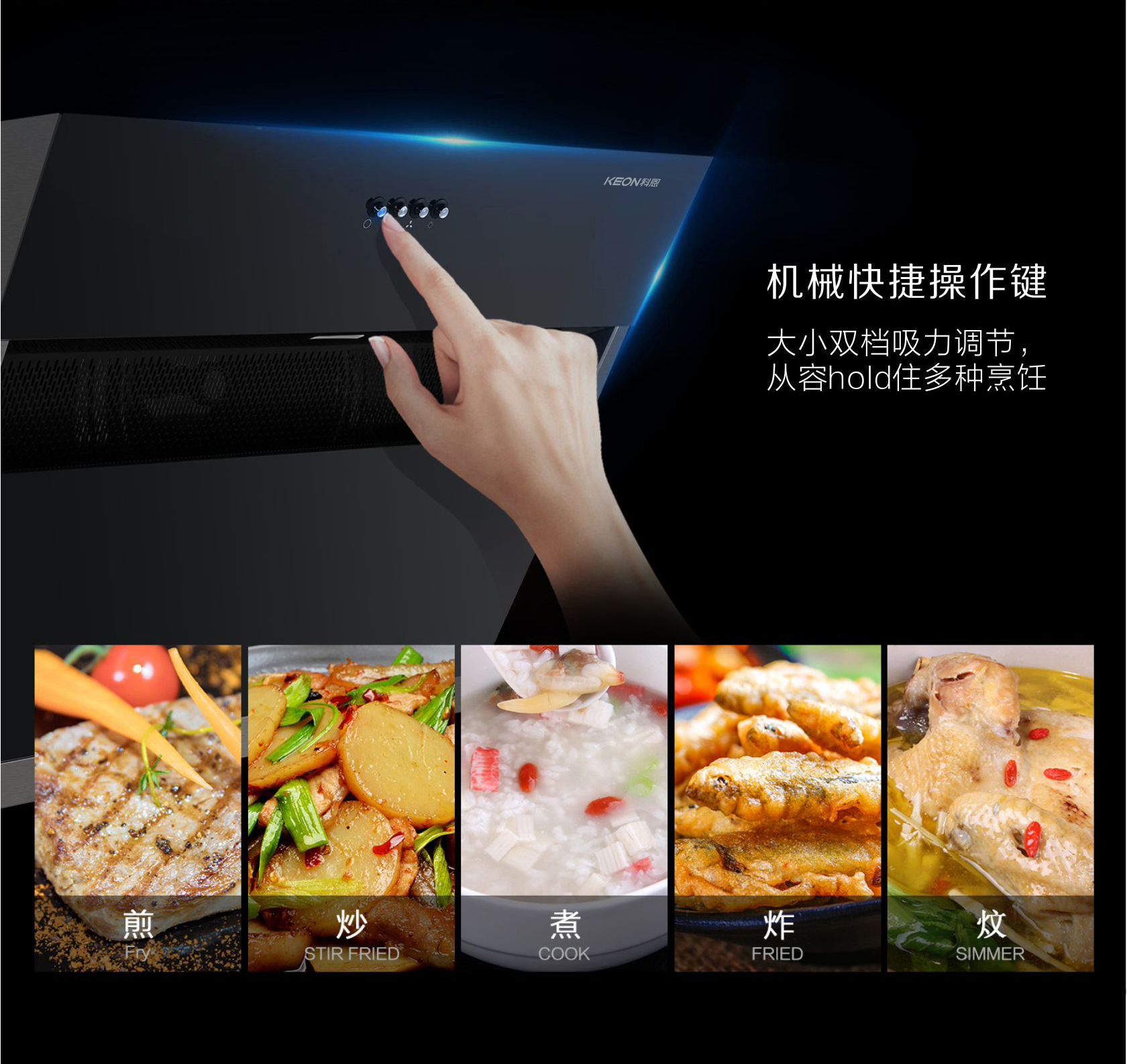 機(jī)械快捷操作鍵,大小雙檔吸力調(diào)節(jié),從容hold住多種烹飪。