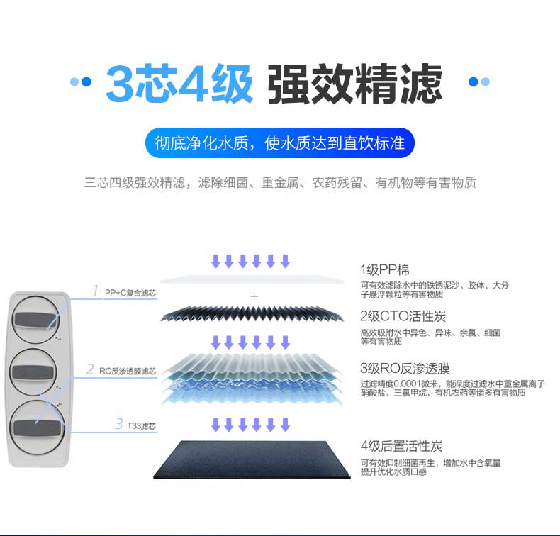 - 三芯四級(jí)強(qiáng)效精濾,濾除99%細(xì)菌重金屬