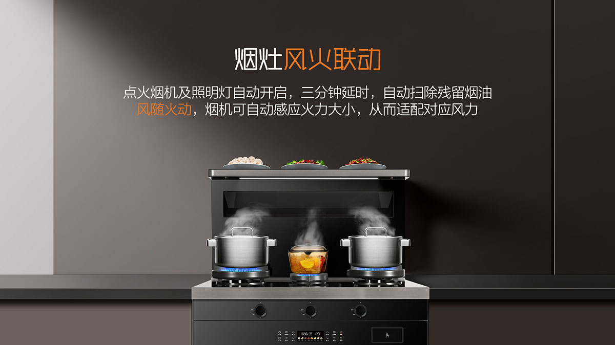 - 煙灶風(fēng)火聯(lián)動,點火煙機(jī)自動開啟,風(fēng)量隨火力大小自動調(diào)節(jié)