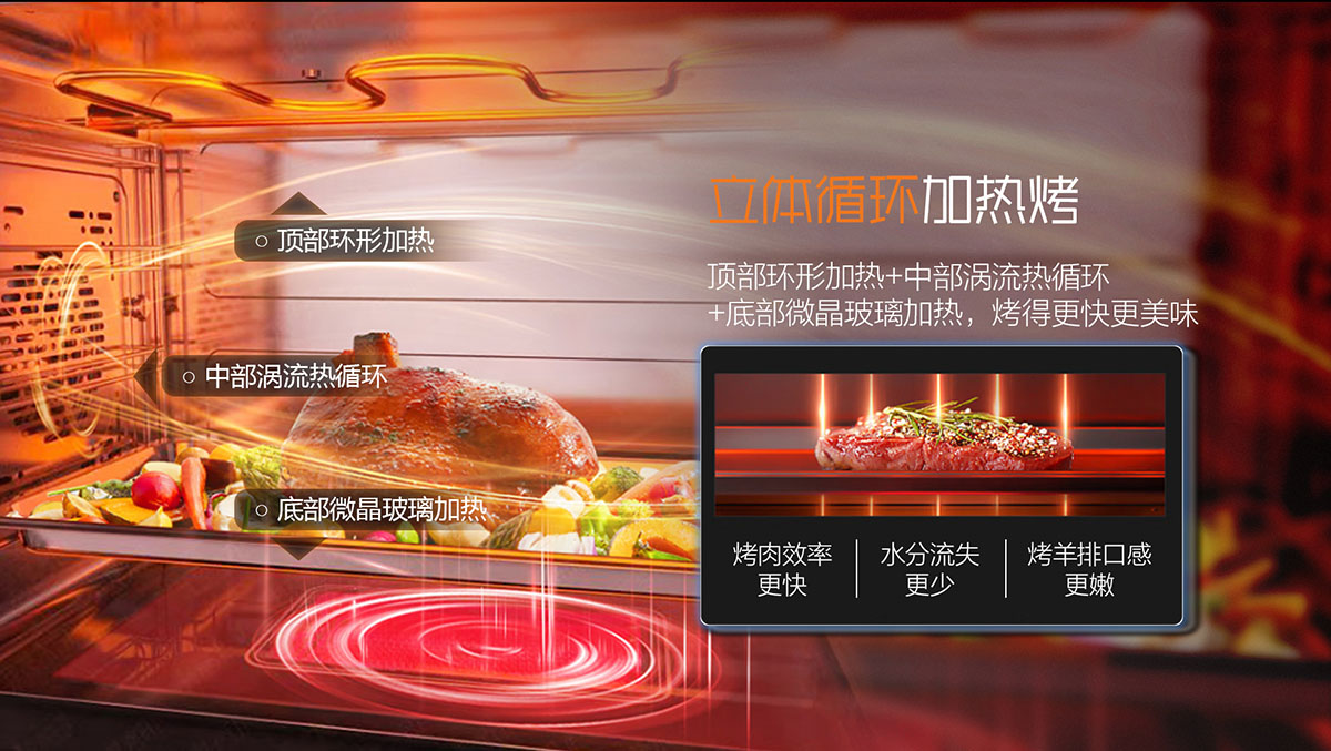 - 頂部環(huán)形加熱+中部渦流熱循環(huán)+底部微晶玻璃加熱,烤得更快更美味