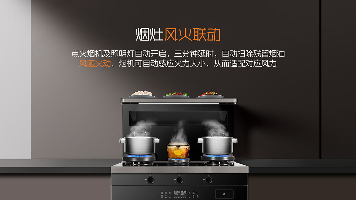 - 煙灶風(fēng)火聯(lián)動(dòng),點(diǎn)火煙機(jī)及照明燈自動(dòng)開啟,風(fēng)量隨火力大小自動(dòng)調(diào)節(jié)