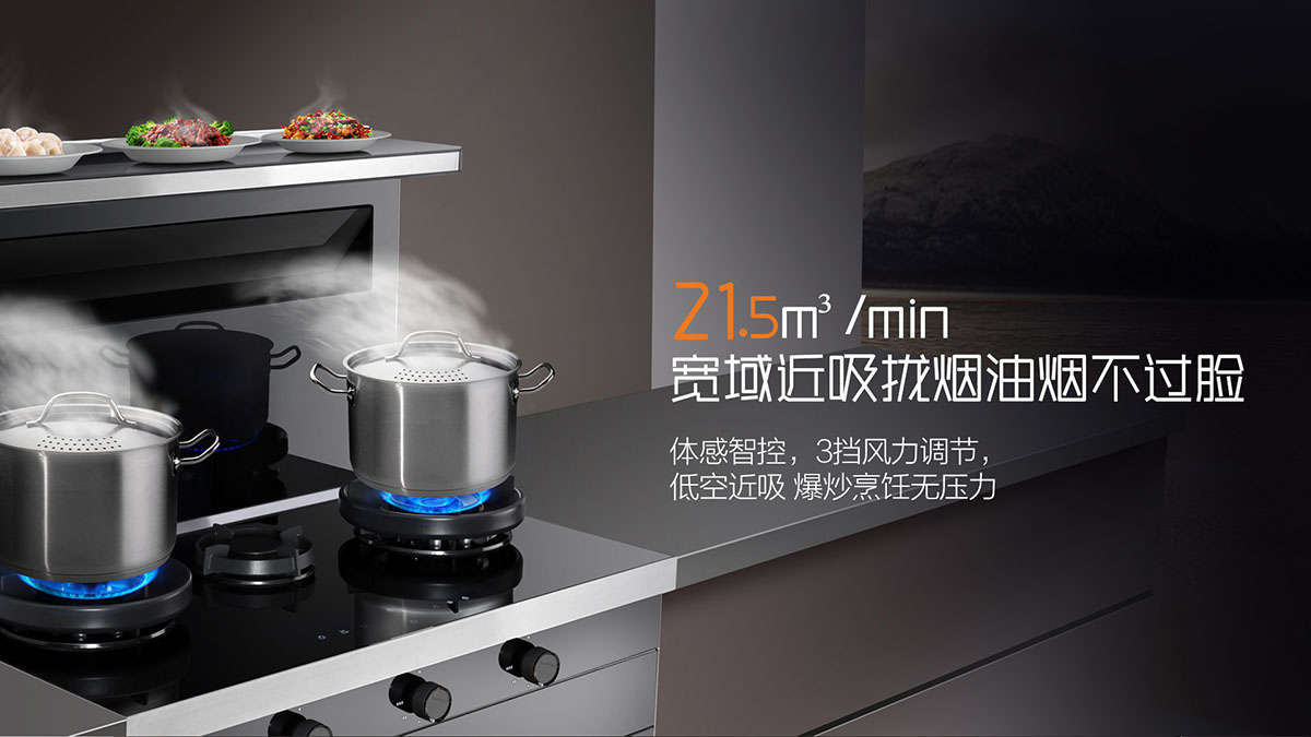- 一級(jí)能效,21.5m3/min寬域近吸攏煙,油煙不過臉,烹飪更隨心