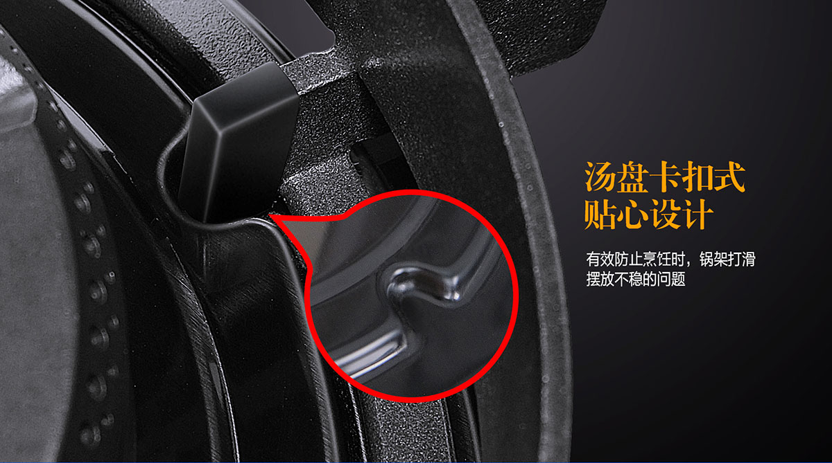 - 湯盤(pán)與鍋架采用靜音卡扣式定位固定,不滑鍋更安全