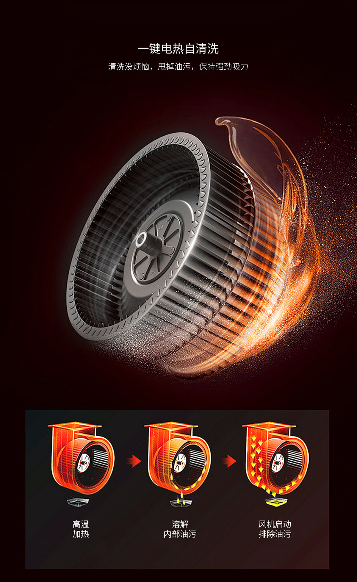 電熱自清洗,甩掉油污,保持強(qiáng)勁吸力