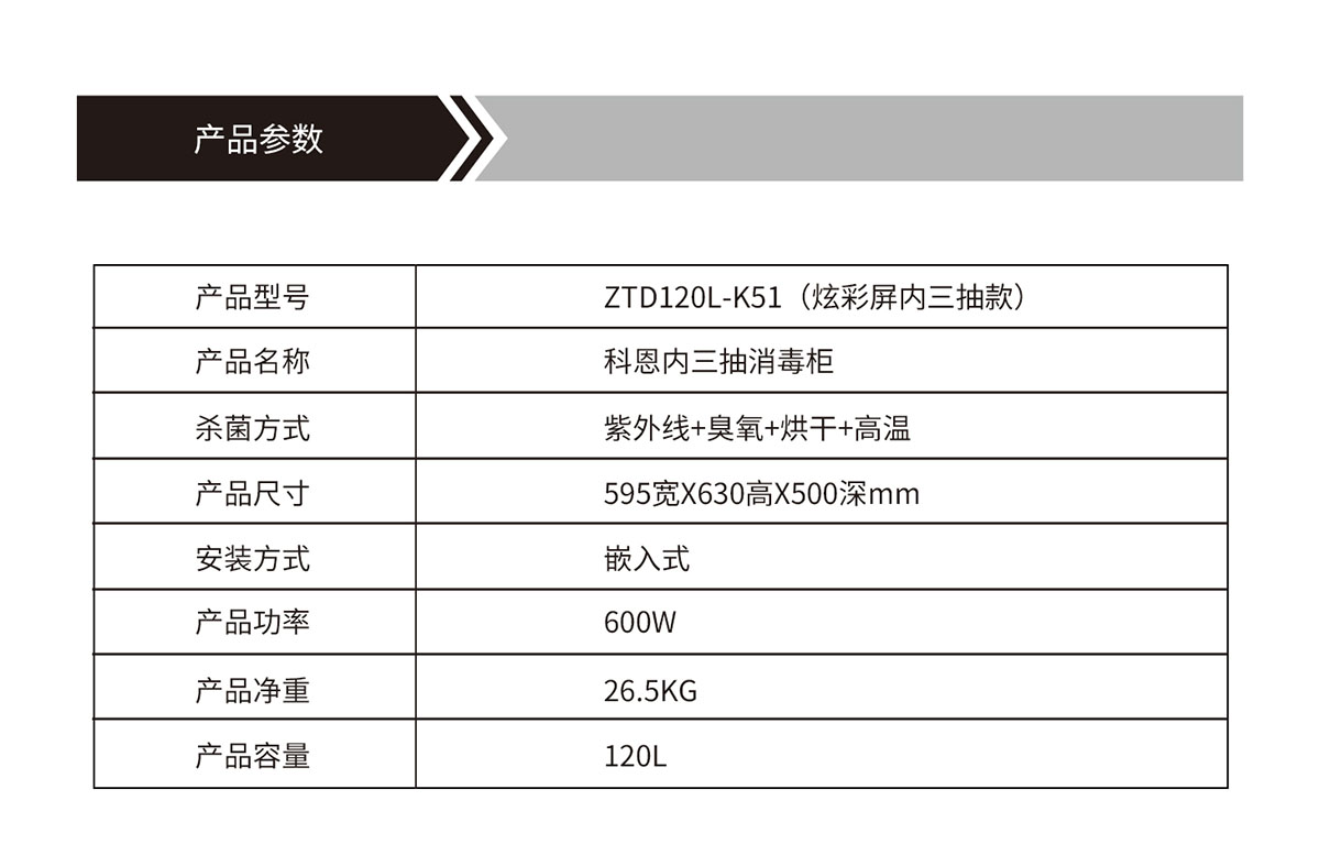 產(chǎn)品型號(hào):ZTD120L-K51(炫彩屏內(nèi)三抽款)產(chǎn)品名稱:科恩內(nèi)三抽消毒柜