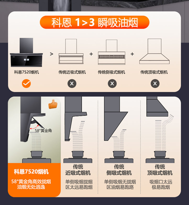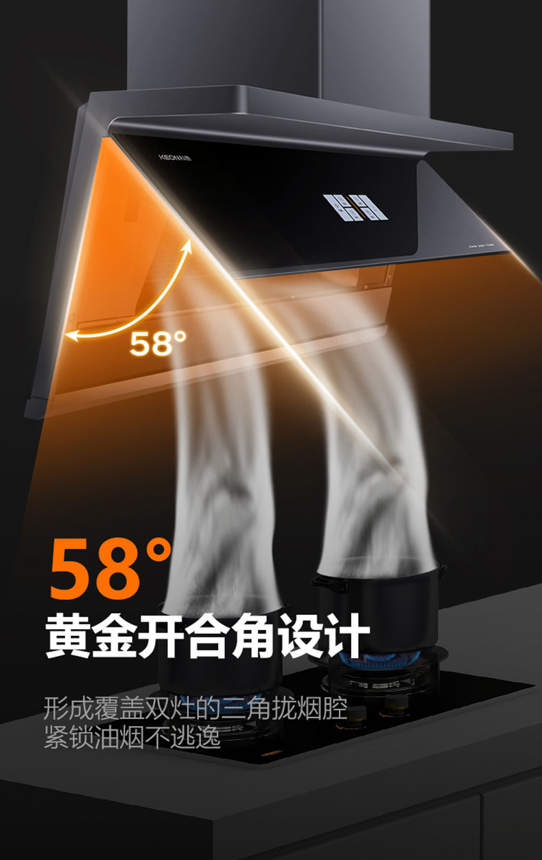 采用58°黃金開(kāi)合角,緊鎖油煙不逃逸