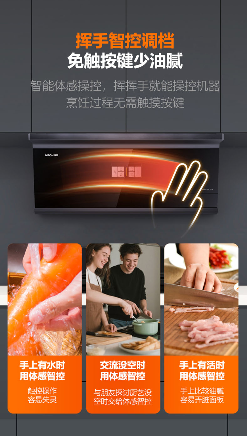 揮手智控,零觸碰調(diào)節(jié)操作面板,讓油污不沾手